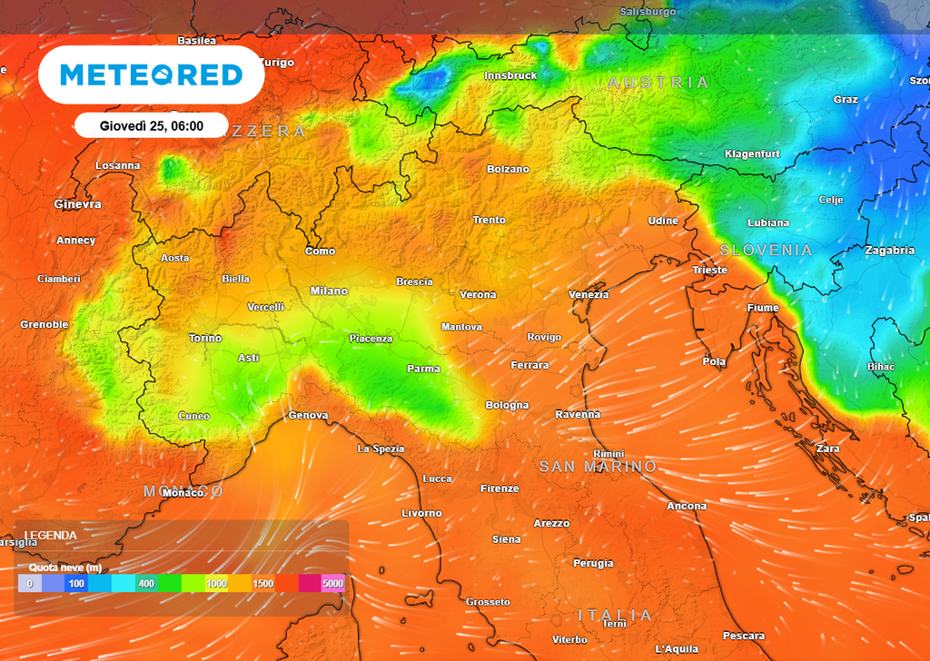Per la Notte della Vigilia, le mappe indicano una massa d'aria a 850 hPa (circa 1400-1500 metri) con temperature comprese tra -3°C e -4°C al Nord. Questo provocherà un crollo dello zero termico.