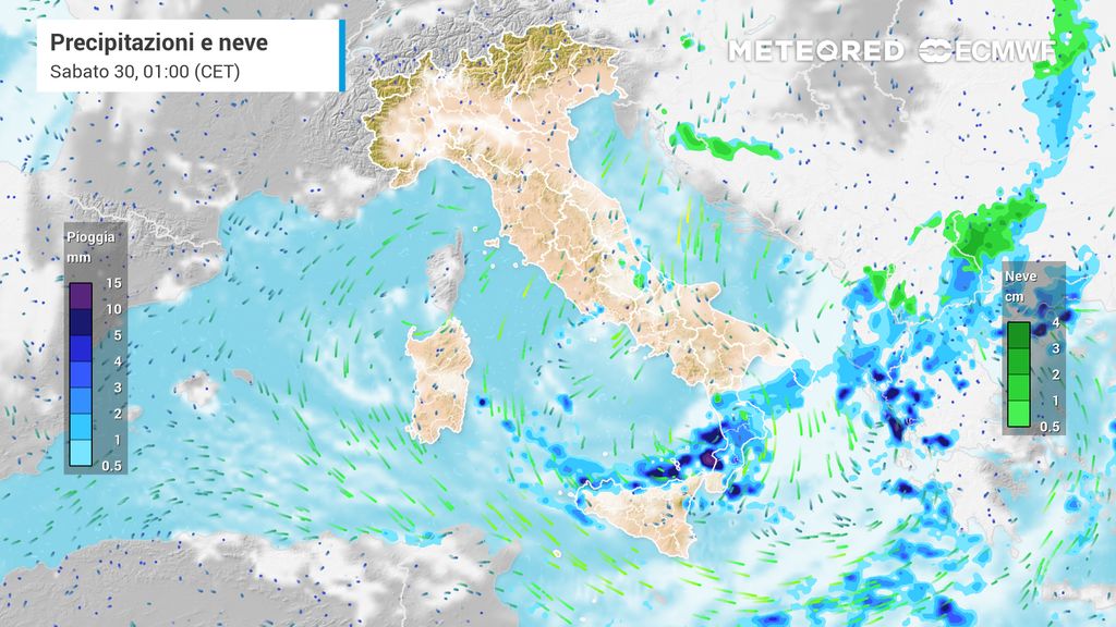 Domenica 1 dicembre si prevedono molte nubi su regioni adriatiche dalla Romagna alla Puglia, su tutta la dorsale appenninica e al Sud dove è previsto un mercato calo delle temperature con piogge e possibile formazione di temporali, più probabili sul nord della Sicilia, su Puglia Garganica e Salento e neve su Sila, Aspromonte, Nebrodi e Madonie.