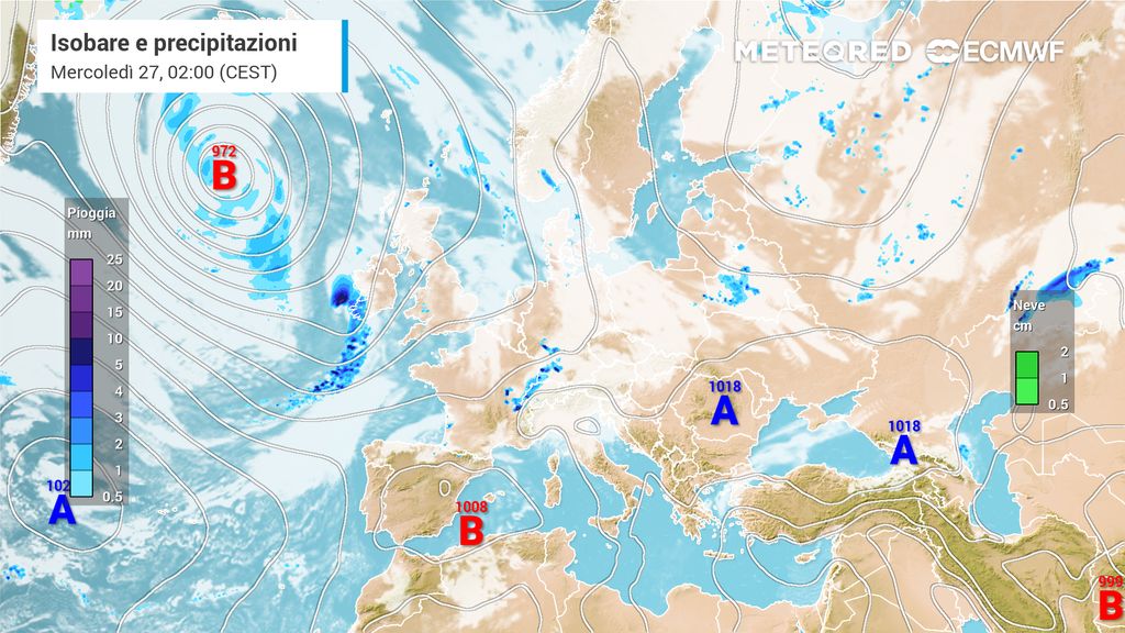 A metà settimana, con l’assestarsi della saccatura, i rovesci diventeranno più lenti, con precipitazioni più intense nelle regioni occidentali e settentrionali. Non si possono escludere temporali localizzati, soprattutto dove l’aria umida sudoccidentale incontrerà quella più fresca del nord.