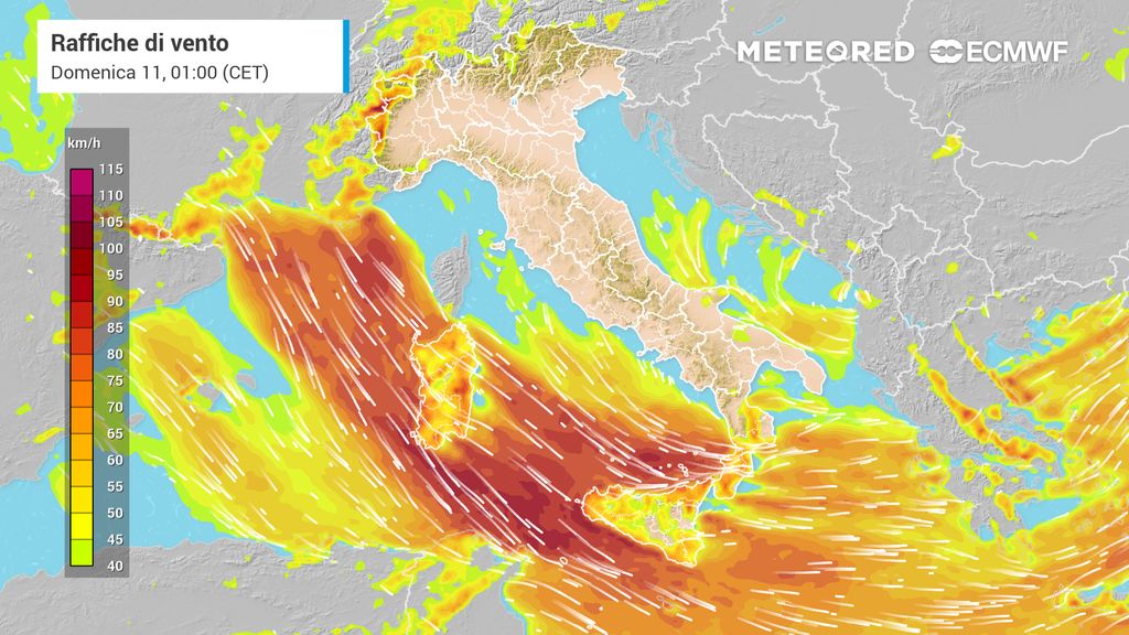 Questo forte “gradiente barico orizzontale” acuirà ulteriormente la spinta di masse d’aria più miti, di origine temperata marittima, dal Mediterraneo occidentale, che attraverso l’attivazione di una impetuosa ventilazione da ovest-sud/ovest, attraverso il Mare di Corsica e il Mar di Sardegna, si propagherà domani a tutto il Tirreno e il Mar Ligure a largo, spingendosi fino alle coste di Toscana, Lazio, Campania, Calabria, Basilicata.