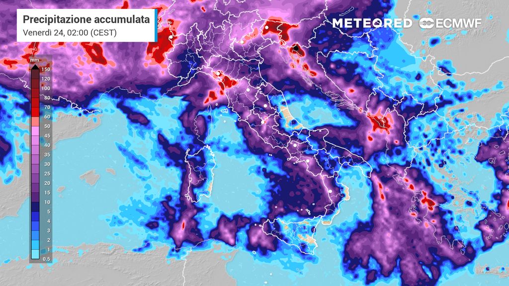 Nella giornata di giovedì 23 ottobre il maltempo raggiungerà la sua fase più acuta. Il centro del ciclone si posizionerà sulla Sardegna, richiamando aria molto umida e instabile dai quadranti meridionali.
