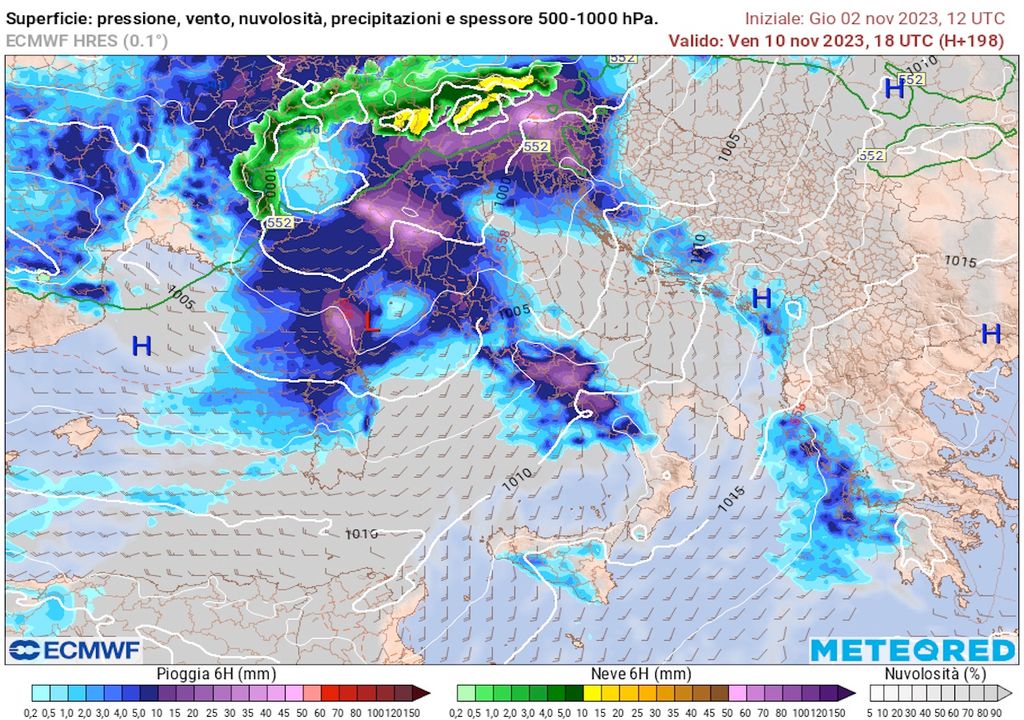 Fra il 9 e 10 novembre nell’ambito del flusso perturbato Atlantico si accentuerà una saccatura con ingresso stavolta di masse d’aria tardo autunnali, calo dello zero termico anche a 1300 m sulle Alpi e 1500 m in Appennino, così nella fase perturbata di giovedì e venerdì oltre alle consuete piogge e temporali anche diffusi al nord le Alpi potrebbero ricevere una bella nevicata anche da 1000 m in su, localmente anche 700-800 m. Probabile anche la prima imbiancata a quote di media montagna in Appennino ligure e Tosco-emiliano. La lunga perturbazione, estesa in longitudine, porterà rovesci temporaleschi anche al centro, al sud, Sardegna e in parte anche Sicilia.
