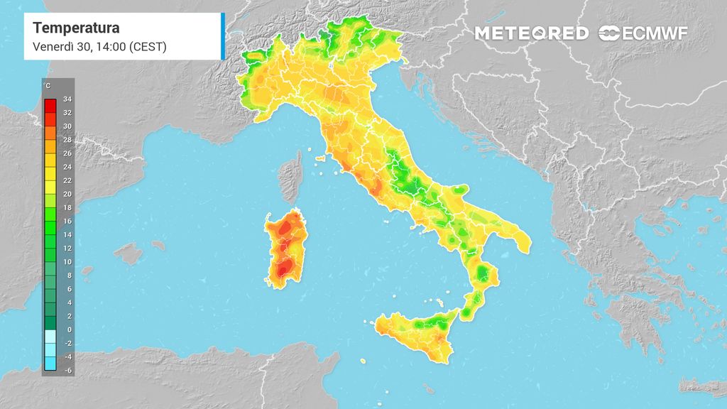 Le temperature saranno in aumento su tutti i settori, tranne che sul basso versante adriatico, dove il maestrale continuerà a farsi sentire. Le massime si aggireranno tra i 25 e i 30°C su tutta la Penisola.