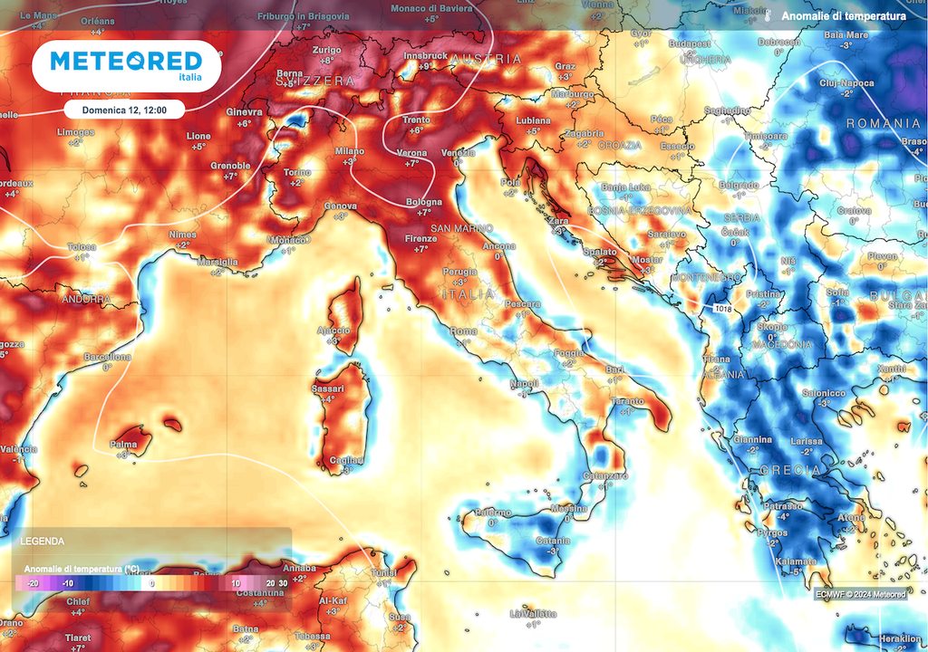 Da lunedì l’anticiclone cederà in fretta, lasciando spazio all’avanguardia di una saccatura in approfondimento verso la Francia e a un canale depressionario al suolo, che porterà poi un marcato peggioramento martedì e mercoledì. Al sud invece affluirà aria calda africana.
