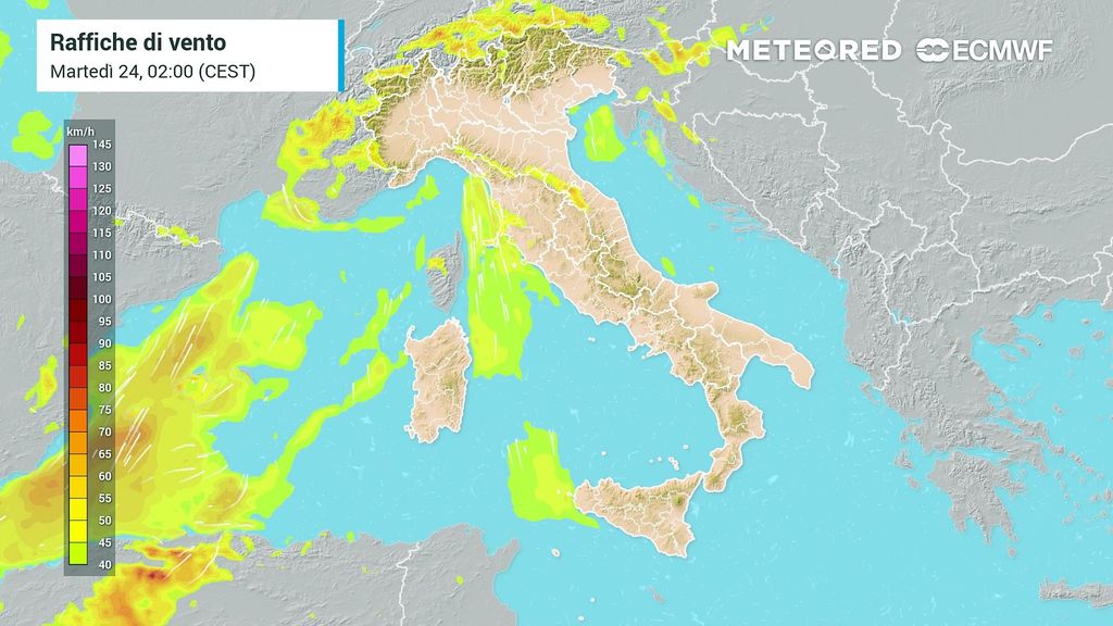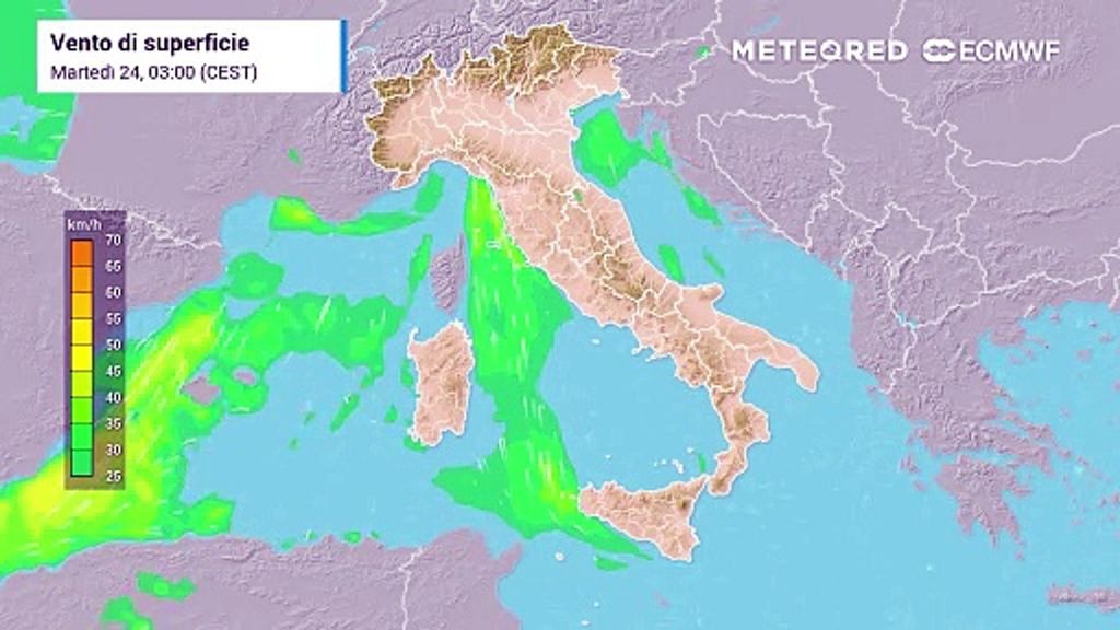 Una parte dell’intenso flusso in uscita dal Rodano tenderà a spingersi verso est, urtando con i monti della Corsica nord-occidentale e piegano verso nord-est, in direzione delle coste del levante ligure, come sostenuti venti di libeccio e ostro che bordando i rilievi dell’immediato entroterra raggiungeranno il Golfo di Genova, mascherandosi come correnti di scirocco e levante (E-SE) sul capoluogo ligure.