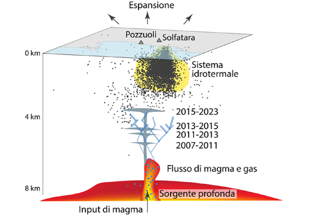 Utilizzando tecniche avanzate, come la geodesia, le simulazioni numeriche e la petrologia, i ricercatori sono riusciti a mappare il movimento del magma nelle profondità della caldera nell’arco di 16 anni, dal 2007 al 2023, ossia dall’inizio della nuova fase bradisismica del vulcano che dura ancora oggi.
