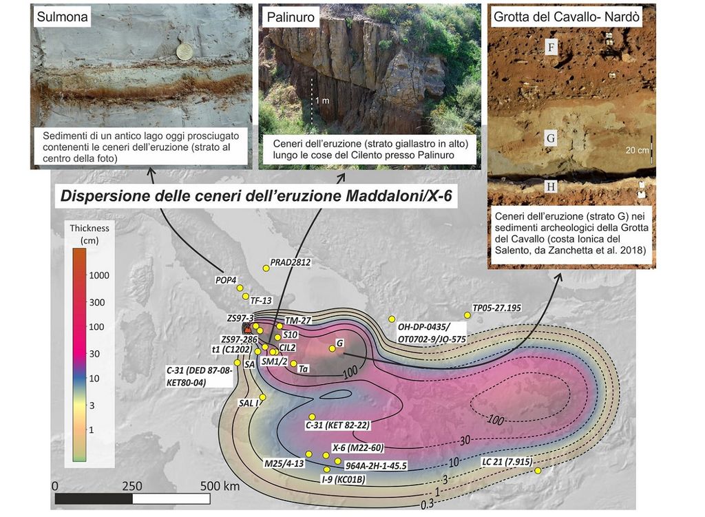 Attraverso questo approccio multidisciplinare, comunemente applicato ad eruzioni recenti le cui tracce sono chiaramente documentate intorno al vulcano, i ricercatori hanno ricostruito i principali parametri eruttivi di un’antica eruzione Flegrea di 109.000 anni fa, denominata ‘Eruzione di Maddaloni’, pressoché inaccessibile nell’area del vulcano ma ben documentata dalle ceneri depositate in aree remote, note con la sigla ‘X-6’ e rinvenute in un’ampia area del Mediterraneo, dall’Italia centrale fino alla Grecia.