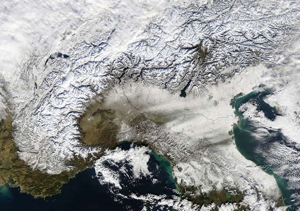 Sulla pianura Padana la neve cade diffusa ovunque, perfino sulle coste Adriatiche regge il cuscino di aria fredda, tanto che l’immagine del satellite Terra-Modis della NASA del giorno 18 è di quelle storiche e rare con quasi l’intera pianura bianca, salvo il Piemonte occidentale in ombra pluviometrica. Mediamente caddero 10-20 cm di neve, non straordinari per il nord ma peculiari per le basse temperature e per la neve particolarmente farinosa.