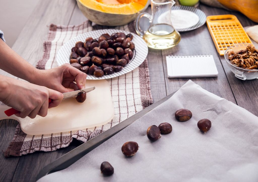 2) Incisione: è il passaggio cruciale, poiché protegge l’integrità della castagna durante la cottura. Quando le castagne sono nel forno, l’acqua presente al loro interno si trasforma in vapore, aumentando il volume della polpa e la pressione interna. Se la buccia esterna resta intatta, la pressione interna può far “esplodere” la castagna.